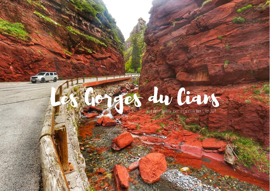 Nous ne sommes pas encore arrivés à destination qu'on est déjà sous le charme! nous entrons dans les Gorges du Cians, nous les apercevons, ces fameuses grandes falaises rouges orangées typiques du site, et réputées pour faire parti des plus belles gorges d'Europe, c'est très impressionnant, et malgré un ciel plutôt voilé, cette couleur particulière de roche, tranche fortement avec le paysage, c'est hyper contrasté et haut en couleur! j'adore!.