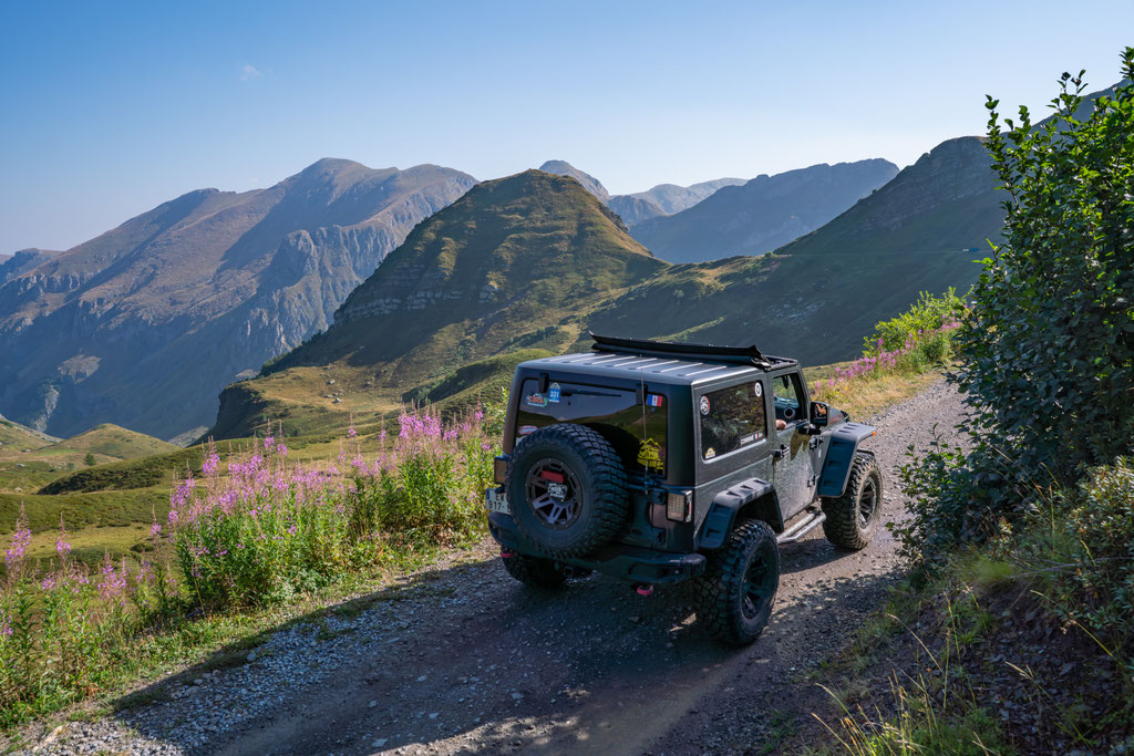Toujours au volant, nous poursuivons la piste, avec un enchainement de virages serrés, dans une superbe ambiance de montagne, avec prairies vertes et vue imprenable!.