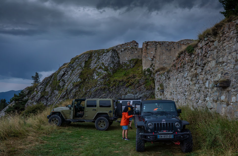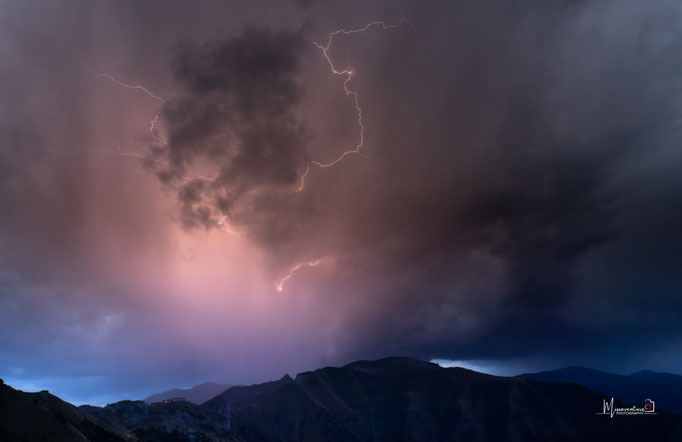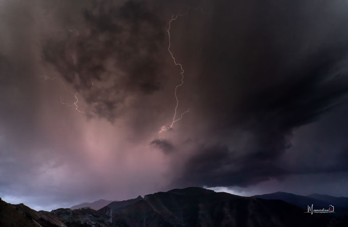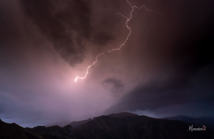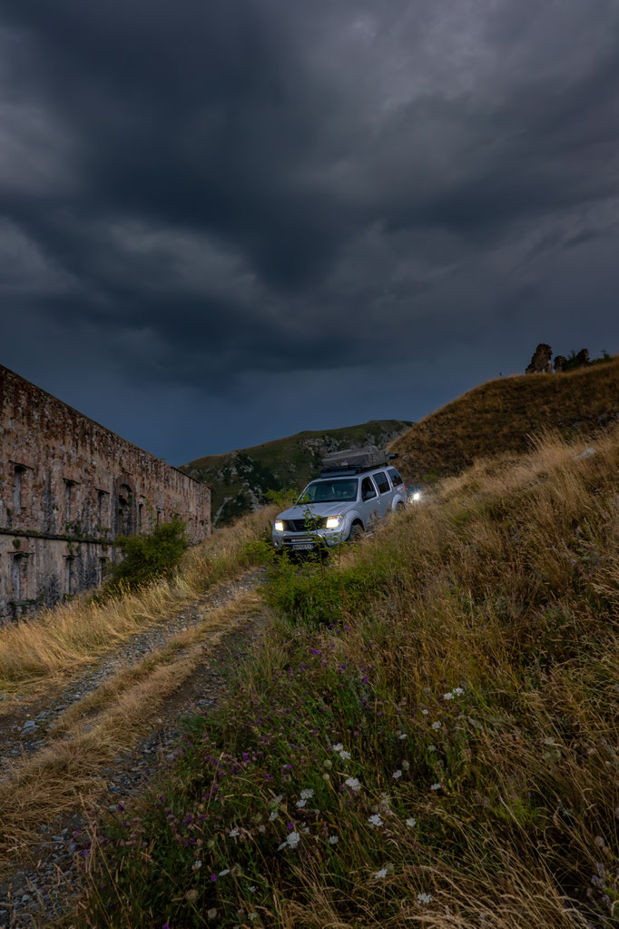 Nous arrivons au Fort de Marguerie sous un ciel extrêmement menaçant, il ne faut pas attendre bien longtemps, pour qu'il se déchaine au dessus de nous, à peine installés pour la nuit; l'orage se met à gronder violemment, pour notre plus grand plaisir de chasseurs (oui, avec Mr, on adore photographier la foudre) des éclairs viennent illuminer le Fort centrale de Tende, et la montagne qui nous font face! quel spectacle!.